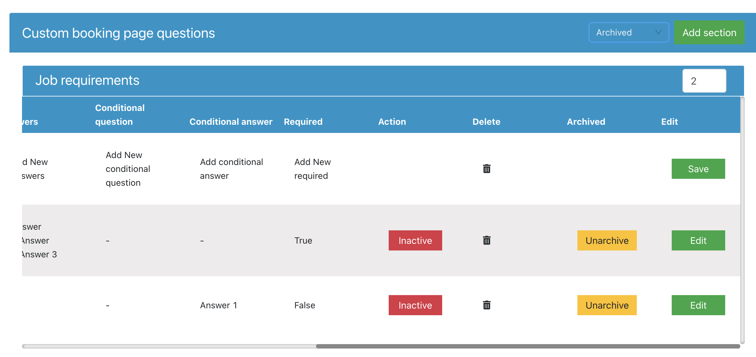 - After saving a new question to the right of the table, press the Inactive button to activate the question so it appears on the customer portal.